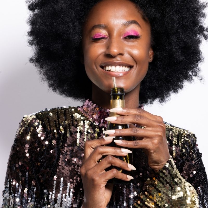 De long almond vorm zorgt voor een natuurlijke, slanke en verzorgde look, terwijl de glazed glitter finish een luxe, skin-like glow geeft.